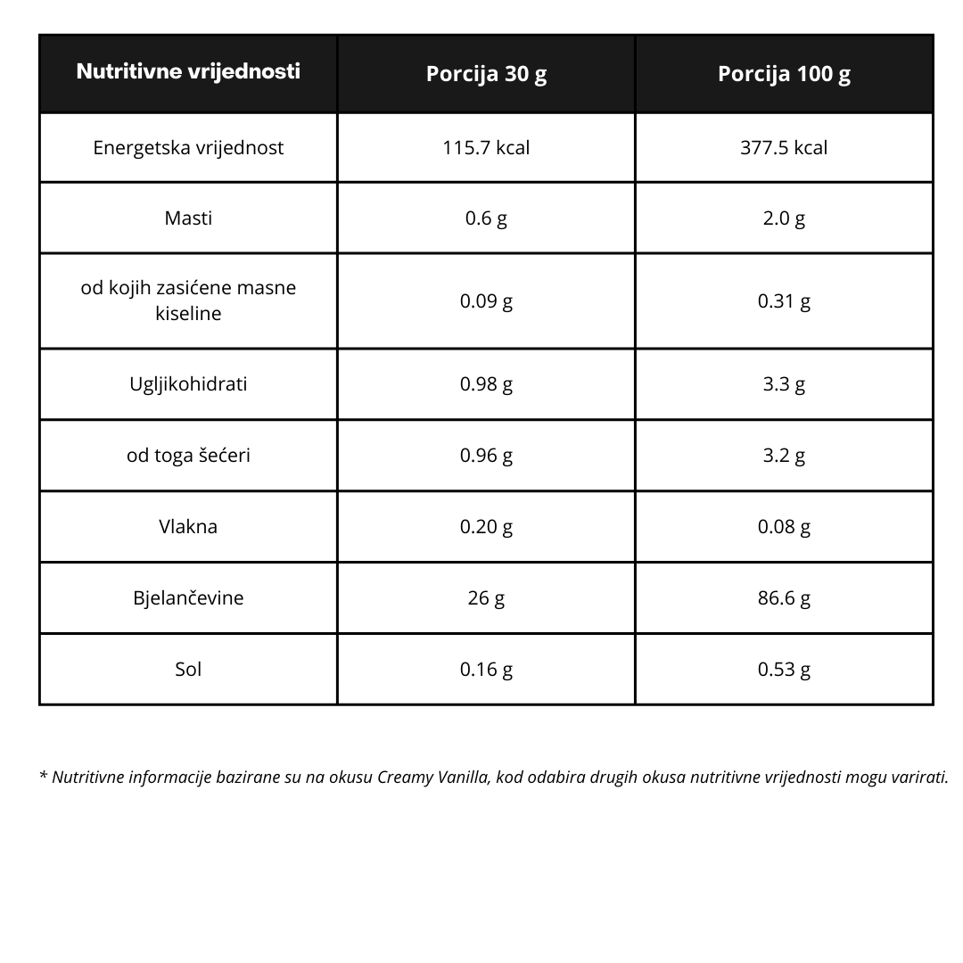 Visoka koncentracija proteina uz minimalne udjele šećera, masti i laktoze.